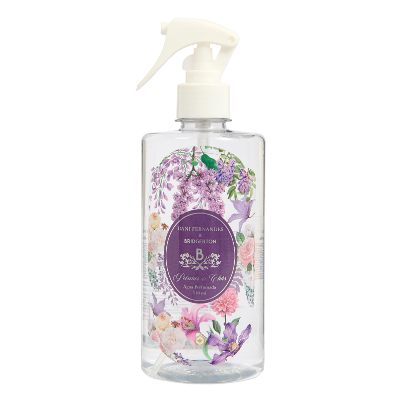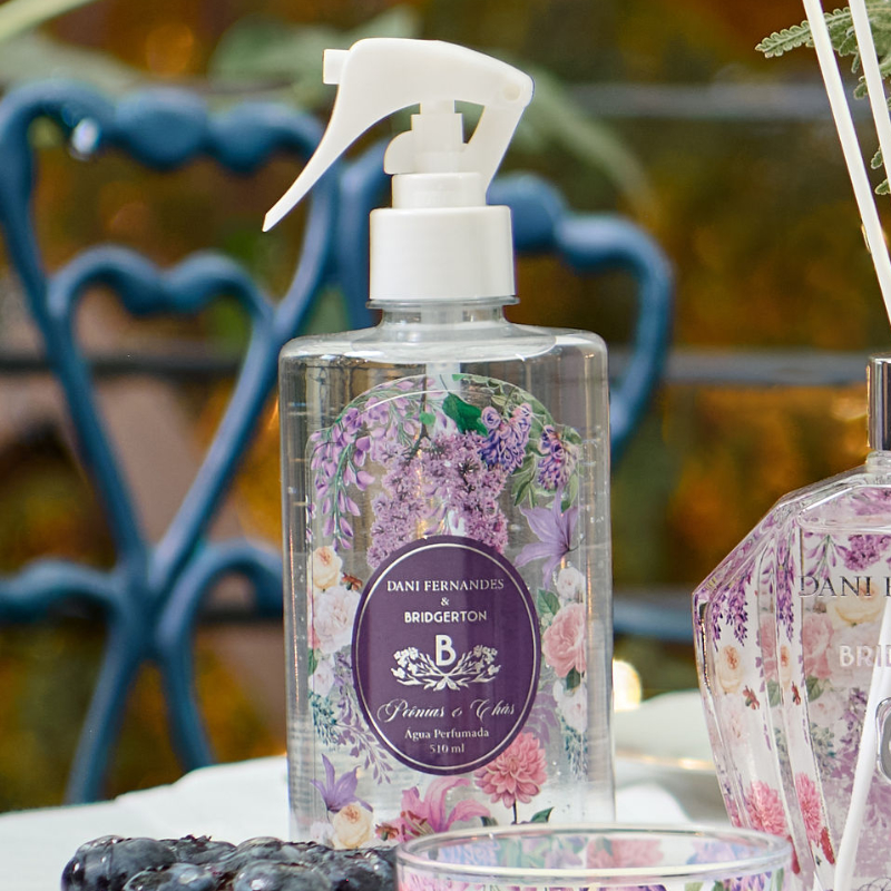 Na collab Dani Fernandes & Bridgerton, da Netflix e Shondaland, ela traduz o charme da perfumaria decorativa em um gesto simples do dia a dia — borrifar e sentir o ambiente ganhar outra atmosfera.