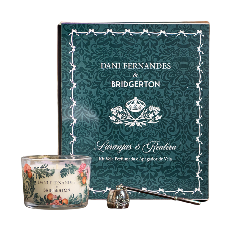 Na collab Dani Fernandes & Bridgerton, da Netflix e Shondaland, a vela perfumada leva para a casa o frescor cítrico sofisticado de Laranjas & Realeza, criando atmosfera de luz e presença marcante. O apagador metálico finaliza o momento com cuidado: preserva o perfume no ar e ajuda a evitar fumaça excessiva, mantendo a experiência refinada até o último instante.
