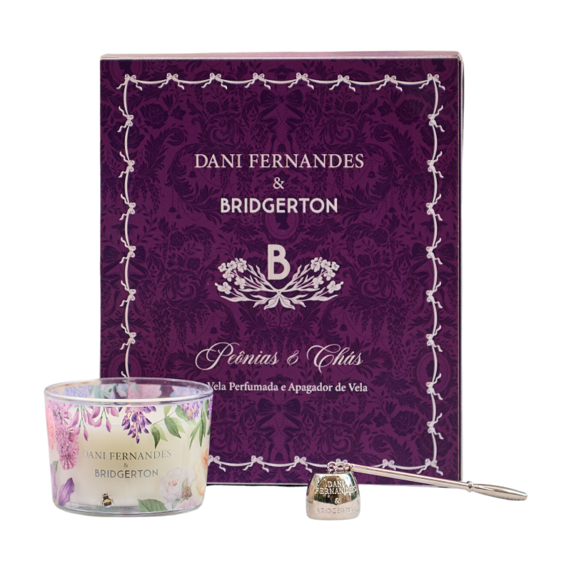 Na collab Dani Fernandes & Bridgerton, da Netflix e Shondaland, a vela perfumada leva o aroma delicado de Peônias & Chás para a casa, enquanto o apagador metálico finaliza o momento com cuidado: preserva o perfume no ambiente e ajuda a evitar fumaça excessiva.