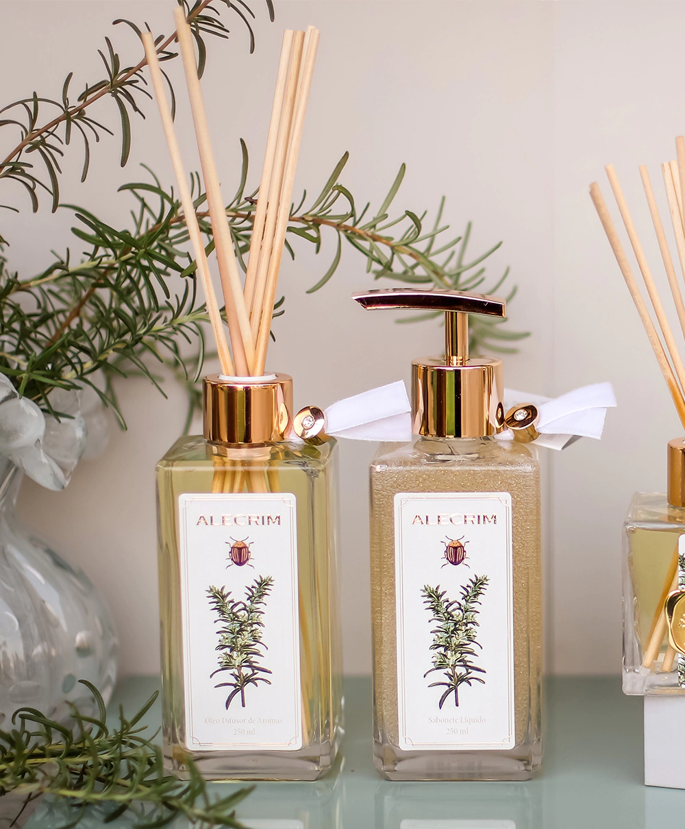 O Sabonete Líquido com Glitter Alecrim 250ml Dani Fernandes combina uma fragrância revigorante com um toque de sofisticação para seu ambiente. Com notas frescas de alecrim e lavanda, enriquecidas por jasmim, cravo folhas e gerânio, o aroma é finalizado com o toque elegante de musk e pau rosa. Além de sua fórmula suave, o brilho do glitter transforma o sabonete em um item decorativo único, perfeito para quem busca beleza e funcionalidade.